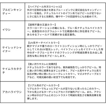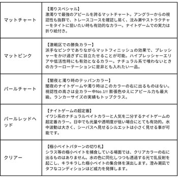 寸法(mm)125質量(g)24タイプフローティングレンジ50~100cmリングサイズ#4飛距離(m)MAX 70フックサイズ#4内容量1個