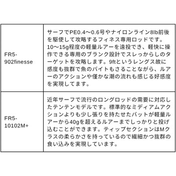 サーフでPE0.4~0.6号やナイロンライン8lb前後を駆使して攻略するフィネス専用ロッドです。10~15g程度の軽量ルアーを遠投でき、軽快に操作できる専用のブランク設計でスレっからしのターゲットを攻略します。9ftというレングス故に感度も抜群で魚のバイトもさることながら、ルアーのアクションや僅かな潮の流れも感じる好感度を実現してます。