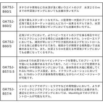 6.0ftからさらに短い5.7ftに設定することで、底物狙いや中深海ではより引き抵抗のあるヘビーウエイトジグを軽くリフトすることが可能であり、近海の青モノや遊泳力のあるターゲットに多様されるショートピッチジャークやハイスピードジャークに高次元に対応します。また、100mを超える深場の青モノ狙いや、100m未満であっても船を流していくドテラシチュエーションで圧倒的に使いやすいレングスとテーパーデザイン。