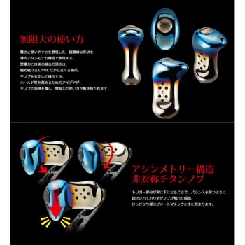 無限大の使い方驚きと使いやすさを表現した、超複雑な形状を薄肉チタンモナカ構造で表現する。想像力と技術の融合の頂は、極め続けるLIVREだから立てる場所。平ノブを安定して操作でき、ホールド性を高めるためのアイデアが、平ノブの前例を覆し、無限大の使い方が解き放たれます。アシンメトリー構造 非対称チタンノブトリガー部分が常に下になることで、バランスを保つように設計されており手がノブが触れた瞬間、ひっかかり部分がオートマチックに手に収まります。