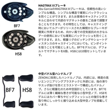 8lb-100mの糸巻量でシャロー全般の釣りやSWベイトフィネスでも使用しやすいギア比7モデルと、14lb-100mの糸巻量でカバー撃ちや中重量ビックベイトなどでも使用しやすいギア比8の深溝ハイギアモデルがラインナップ。