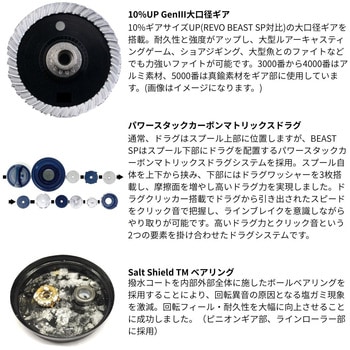 10%ギアサイズUP大口径ギア搭載(REVO BEAST SP対比)、パワースタックカーボンマトリックスドラグ搭載で高いドラグ力を実現。大型ルアーキャスティングゲームや、大型魚とのファイトに特化した機能を搭載し、ハイパフォーマンスを実現するBEAST SP
