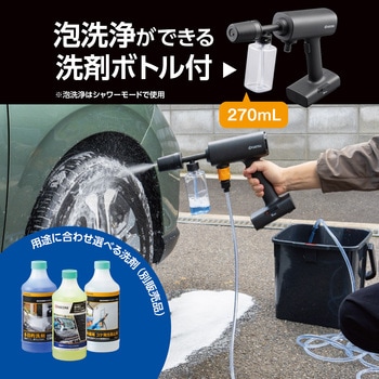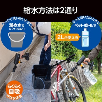 【特長】水道や電源のない場所でも2Lペットボトル・バケツ・タンクから吸水できるのでサッと使いたいとき、ちょっとした汚れを落としたいとき、長い時間掃除したいときに便利な軽量・コンパクトでどこにでも持ち運べる充電式ポータブルウォッシャーです。