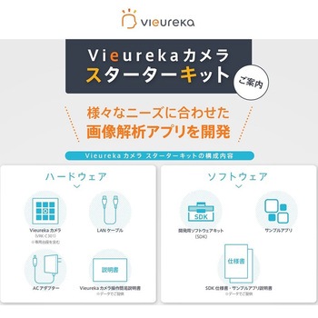 Vieureka(ビューレカ)カメラは、CPUを内蔵したIoTカメラです。カメラ内で画像解析を行うことができるので、クラウドへ大容量の映像データを送信せずに解析処理が可能です。本キットは、手軽にVieurekaカメラを活用した画像解析システムの開発や導入の検討をするためのスターターキットです。