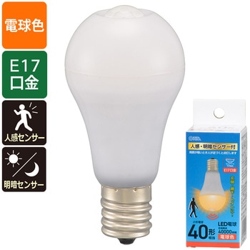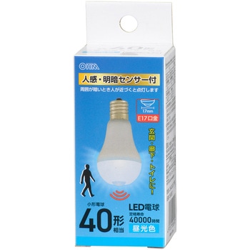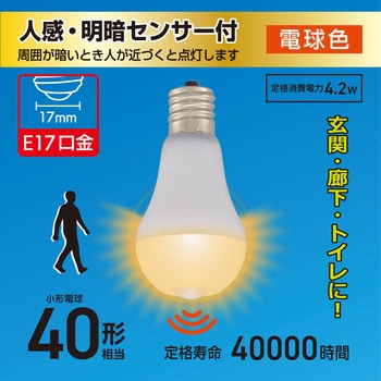 暗い場所で自動点灯する人感・明暗センサー搭載のE17小形LED電球。40形相当の明るさで、玄関・廊下・トイレなどの省エネ照明に最適。人の動きがなくなると約2分で自動消灯。消灯30秒前に50%減光するお知らせ機能付きで使いやすい。電球色/昼光色の2種類。消費電力4.2W、寿命40000時間の長寿命設計。