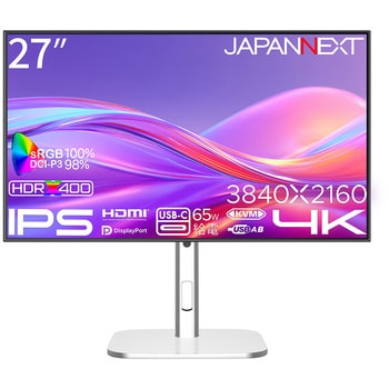 27インチのIPSパネルを搭載し、4K(3840x2160)解像度に対応した液晶モニターです。広視野角上下左右178°を実現します。本製品のIPSパネルは、従来のIPSパネルと比べて深い黒の表現を可能、高いコントラスト比「2000:1」を実現。最大輝度400cd/m2、sRGB:100%、DCI-P3:98%の広色域に対応、HDR400相当の性能を持ちます。HDCP2.2対応で4K配信動画もお楽しみ頂けます。多機能スタンドを搭載、最大140mmの範囲(横置時)で高さを調整可能。ピボット(回転)機能、スイーベル(首振り)機能は、左右各30°の範囲で動かせます。インターフェイスはHDMI、DPとUSB-C。USB-C(最大65W給電)は、対応のPCであればUSB-Cケーブル1本で映像出力とノートPCへの給電が可能。2つの入力を同時に表示する「PBP(Picture by Picture)」に対応、入力の一つを子画面にて表示する「PIP(Picture in Picture)」も可能です。KVM機能に対応。モニターに接続したキーボード、マウスをデスクトップPCやUSB-C接続のノートPCで入力を切り替えた際にもそのまま使用可能です。100x100mmのVESAマウントに対応しますので、別売りのモニターアームなどに使用が可能です。2Wx2のスピーカーを搭載します。本製品には、2年間のメーカー保証が付きます。