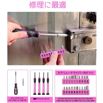 爪付きハンマー、3.5mスチール巻き尺、はさみ、カッターナイフ(18mm刃)、ドライバー延長ロッド、スクリュードライバー(20種ビットセット)、6インチプライヤー、精密ドライバー、L字レンチ(8本)、スクリュードライバービット