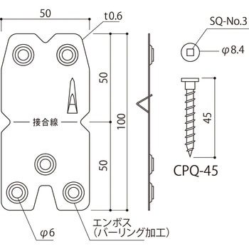 柱と土台、柱と横架材を接合する柱頭柱脚用金物です。従来品よりビスを1本減らしたことで、施工時間が短縮できました。また、サイズを小さくしたことで上下階の管柱と梁成105mmの横架材の接合部でも金物が干渉せず施工できます。上下階の管柱と横架材の接合は梁成105mm以上(上下2枚)で使用できます。本体の板厚が0.6mmなので構造用合板等をそのまま張ることができます。エンボス加工によりビス頭が表面に出っ張りません。軽量なので現場作業が容易です。