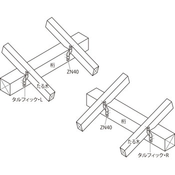 屋根が風圧で吹き上げられないよう、母屋、桁に確実に接合するためにたる木の側面に緊結する金物です。右用・左用があり、たる木に対して左右どちらからでも施工できます。