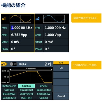 【多彩な波形生成と変調機能】5種の基本波形(正弦波、方形波、パルス、ランプ、ノイズ)に加え、150種類の内蔵波形とユーザー定義の任意波形(最大8Kポイント)をサポート。AM/FM/PM/FSK/スイープ/バースト変調機能を搭載し、信号処理・通信実験・EMC試験など多様な用途に対応します。周波数分解能は1μHz、安定度±30ppm(0~40℃)で、長時間測定でも周波数ドリフトを最小限に抑えます。