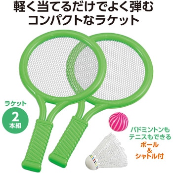 手軽にスポーツ気分!バドミントンもテニスも楽しめる2WAYラケット!軽く当てるだけでよく弾むコンパクトラケットです。ボールとシャトルが1つずつ付属しており、テニスもバドミントンも楽しめます。ラケットは軽くて柔らかいメッシュ素材を使用しており、小さなお子さまでも扱いやすい設計になっています。子どもから大人まで一緒に遊べる、おすすめのセットです。遊びやすいサイズで手軽にスポーツ気分を味わえます。丈夫なつくりで屋内外問わず活躍します。対象年齢:6歳以上。
