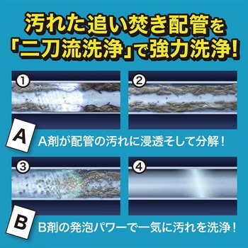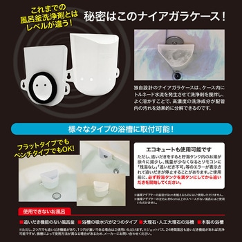 プロ仕様の高濃度風呂釜用洗剤。独自設計の専用ケース(ナイアガラケース)を使用することで、従来比約100倍の高濃度洗浄液を配管内に循環させ、こびりついた皮脂・湯アカ・雑菌・ヌメリ等の汚れをしっかり洗浄します。「ナイアガラーン」はA・B剤を使用する二刀流洗浄。A剤が配管内に固着した汚れを浸透・分解し、B剤の発泡パワーで一気に剥がし取ります。しかも配管保護成分を配合しているので、強い洗浄力なのに配管を痛めにくく、安心してお使い頂けます。