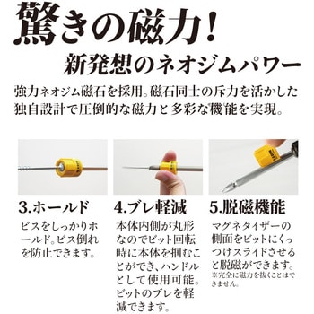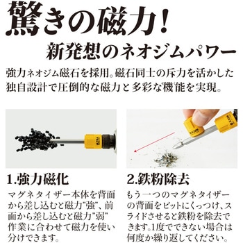 新発想のネオジムパワー。マグネタイザー本体を背面から差し込むと磁力”強”、前面から差し込むと磁力”弱”と作業に合わせて磁力を使い分けることが可能です。先端についた鉄粉はもう一つのマグネタイザーの背面をビットにスライドさせることで除去することが可能です。また、マグネタイザーの側面をビットにくっつけスライドすると脱磁することができます。本体内蔵は丸形状なのでビット回転時に本体を掴むことが可能。ハンドルとしてビットのブレを顕現できます。