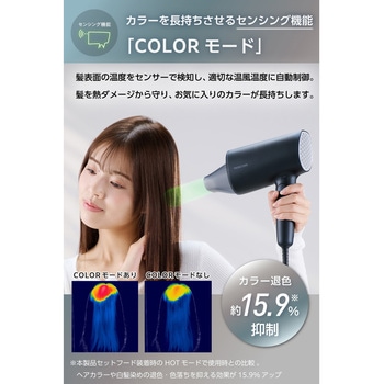 COLORモード:髪を熱ダメージから守るセンシング機能を搭載。ドライヤー使用中の髪表面の温度をセンサーで検知し、適切な温風温度に自動制御。ヘアカラーや白髪染めの退色・色落ちを抑える効果が15.9%アップ(※)し、お気に入りのカラーが長持ちします。 ※本製品セットフード装着時のHOTモードで使用時との比較