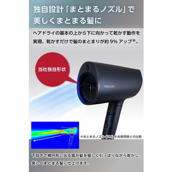 独自設計の「まとまるノズル(TM)」により、乾かすだけで髪のまとまりが約9%アップ(※)します。下向きで楕円形に出る風が髪を優しく引っぱりながら乾かし、美しくまとまる髪に仕上げます。ヘアドライの基本である上から下に向かって乾かす動作を、使うだけで簡単に実現できます。 ※まとまるノズル(TM)を未使用時との比較