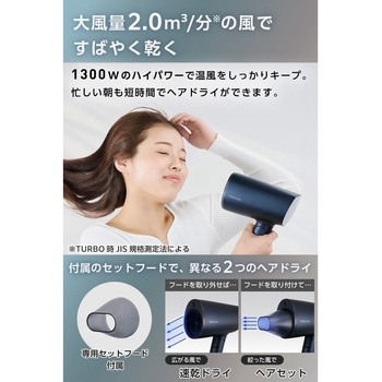 1300Wのハイパワーにより温風をしっかりキープし、大風量2.0m3/分の風で髪をすばやく乾かせるので、忙しい朝も時短でヘアドライができます。