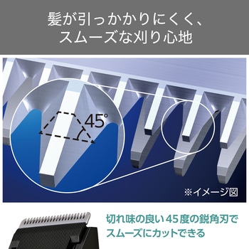 切れ味の良い45度の鋭角刃を採用。髪が引っかかりにくく、スムーズな刈り心地ですばやくセルフカットできます。