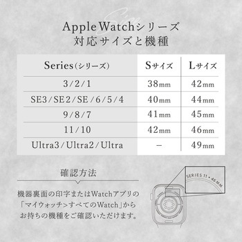 材質スプリットレザー、シリコン、ステンレス質量(g)60(パッケージ込み)本体質量(g)20寸法(幅W×奥行D×高さH)(mm)約32×12.5×182対応機種【Apple Watch 38/40/41/42mm用】38mmサイズ:Apple Watch Series 3、Apple Watch Series 2、Apple Watch Series 1、40mmサイズ:Apple Watch Series SE (第3世代/第2世代/第1世代)、Apple Watch Series 6、Apple Watch Series 5、Apple Watch Series 4、41mmサイズ:Apple Watch Series 9、Apple Watch Series 8、Apple Watch Series 7、42mmサイズ:Apple Watch Series 11、Apple Watch Series 10※42mmサイズの、Apple Watch Series 3、Apple Watch Series 2、Apple Watch Series 1には非対応です。保証期間初期不良のみ交換保証適合手首周(cm)約14~19.5内容量1個