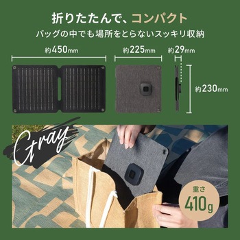 付属品取扱説明書(保証書付)性能【ソーラーパネル発電】最大10W※発電量は設置場所、天候条件、日照時間によって変動します。質量(g)約 610 (パッケージ込み)本体質量(g)410適合機器スマートフォン、タブレット、モバイルバッテリー、その他USB充電機器※すべての機器での動作を保証するものではありません。※接続する機器に合わせたケーブルをご用意ください。※ワイヤレスイヤホンなどの微弱電流機器は充電できない場合があります。定格出力USB Type-A:最大5V/2A、USB Type-C:最大5V/2A、同時使用:5V/2A変換効率(%)【ソーラーパネル】最大22.4本体寸法(幅W×奥行D×高さH)(mm)折りたたみ時:約 225 × 29 × 230、展開時:約 450 × 19 × 230保証期間6ヵ月防塵防水性能非対応ソーラーパネル種類単結晶シリコン面数【ソーラーパネル】2面内容量1個