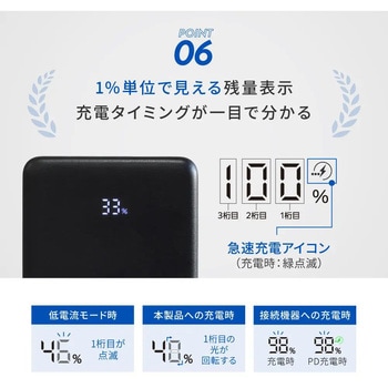 付属品USB Type-C - USB Type-Cケーブル(約30cm)、取扱説明書(保証書付)質量(g)232(パッケージ込み)備考PSE適合製品本体質量(g)186使用温度(℃)充電時:0~35、放電時:-10~35寸法(幅W×奥行D×高さH)(mm)約70×16.2×115適合機器タブレット、スマートフォン、Wi-Fiルーター、加熱式たばこ、オーディオプレーヤー、その他USB充電機器※すべての機器での動作を保証するものではありません。※接続する機器に合わせたケーブルをご用意ください。本製品の付属ケーブルもお使いいただけます。※電熱ベストおよび空調作業服へのご使用は推奨しておりません。また、動作保証もいたしかねますので、ご購入の際はご注意ください。定格出力USB Type-C1 / USB Type-C2:5V/3A、9V/2.22A、12V/1.67A(PD20W)、PPS 5-5.9V/3A、5-11V/2A、USB Type-A:5V/3A、9V/2A、12V/1.5A(18W)、合計最大出力:5V/3A(15W)※USB PDで充電を行う場合は、接続機器やケーブルがPD対応である必要があります。バッテリーリチウムイオン電池 3.85V 10000mAh、38.5Wh充電時間空の状態から満充電まで約3時間(PD18W充電時)出力容量5V/6800mAh、9V/3700mAh、12V/2700mAh保証期間1年間保護機能過充電(電圧/電流)保護、過放電(電圧/電流)保護、短絡(ショート)保護、温度保護定格入力USB Type-C1 / USB Type-C2:5V/3A、9V/2A、12V/1.5A(PD18W)使用可能回数約300回※機器および使用条件によります。内容量1個