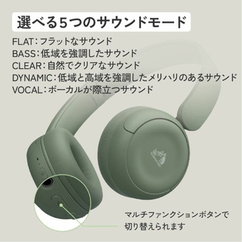 5つのサウンドモード(FLAT:フラットなサウンド/BASS:低域を強調したサウンド/CLEAR:自然でクリアなサウンド/DYNAMIC:低域と高域を強調したメリハリのあるサウンド/VOCAL:ボーカルが際立つサウンド)を搭載。マルチファンクションボタンを1秒押し続けると、 サウンドモードが切り替わります。