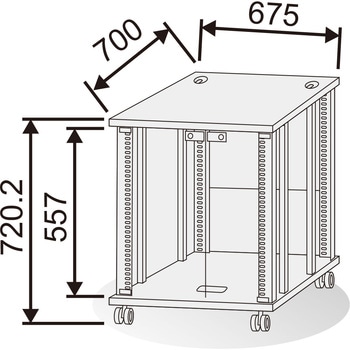 棚板の取付位置は、EIAピッチで上下移動できるので、機器と棚板との隙間なく取り付けられます。EIA下付きとなります。棚板はオプション(別売)です。