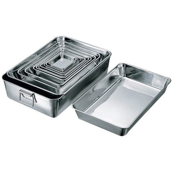 耐久性のあるベーシックなステンレス角バット。食材の一時保管や、下味付けなどに便利な形状です。同サイズの角バットは、ピッタリ重なりコンパクトに収納が可能です。下ごしらえ、水切り、油切り、冷蔵保存など…別売りの蓋、アミ、水切バットを組み合わせることで用途が広がります。蓋を組み合わせると、積み重ね可能となり、限られた作業スペースや保管スペースを有効に使う事ができます。