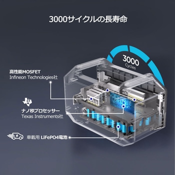 ・リン酸鉄リチウムイオンバッテリーを採用しています。他のバッテリータイプと比べて安全性が高いバッテリーで、充放電のサイクル数が多い(バッテリー寿命が長い)のが特徴です。本製品は充放電3000サイクル (80% DOD, 80% EOL)を可能にした長寿命のポータブル電源です。