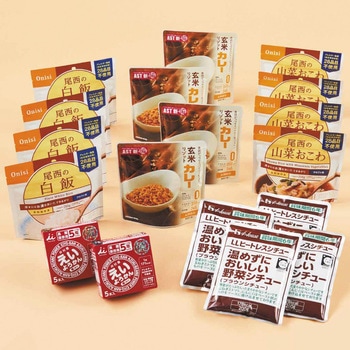 【セット1】災害用レトルト食品(やさしい中華ごはん200g)×4、新・備 玄米リゾットトマト×4、LLヒートレスカレー(温めずにおいしい野菜カレー200g)×4、アルファ米(白飯100g)×4、副食.ライスクッキー(8枚入)×4、【セット2】アルファ米(わかめごはん400g)×4、新・備 玄米リゾット和風×4、おいしい防災食(ホワイトシチュー250g)×4、アルファ米(白飯×100g)×4、副食.防災用ネオ玄米スナック(40g/4枚入)×4、【セット3】アルファ米(山菜おこわ100g)×4、新・備 玄米リゾットカレー×4、LLヒートレスカレー(温めずにおいしい野菜シチュー200g)×4、副食.えいようかん(1箱5本入)×2