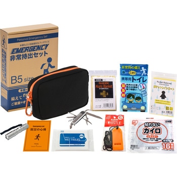 収納ポーチ・防災の心得・ホイッスル・カイロ・レインコート・携帯用トイレ・LEDライト・アルミブランケット・除菌アルコールウェットティッシュ・8徳ナイフ