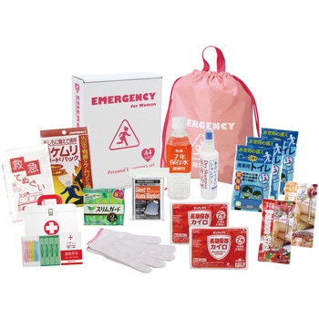 被災当日1日分の滞在をサポートする災害対策セットに女性ならではの商品をプラス。コンパクトなA4箱に収納できるので棚や引き出しで保管しやすいです。