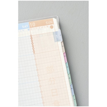 見たいページへのアクセスがしやすくなるインデックスシール。1月から12月までの各月と、DAIRY・LIFEの主要コンテンツ名が入ったインデックスの2シートセット。A5スリム、B6スリムで共通して使用できるサイズ。貼りつけがしやすいつかみしろ付き。ジブン手帳レギュラーと一緒に使いやすいカラフルな色使い。