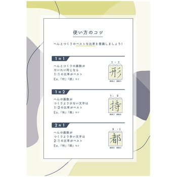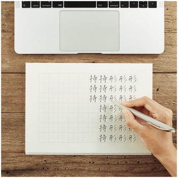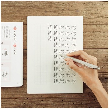 書道家 大江静芳先生監修、大人のためのペン字練習帳へんとつくりの比率を意識して練習出来るよう、20mm×20mmのマス目を3分割するドットが入っています。縦横どちらでも使用可能。中紙はコクヨを代表するロングセラー商品「書翰箋」の原紙を採用。水性インクボールペンで書いても速乾性が高いので、ペン字の練習に最適。表紙巻き製本なので、表紙を折り返しても浮きが少なく、省スペース且つ一枚の用紙に書くように使えます。はぎ取って使う事もできるので、厚い下敷きでも使いやすいです。大人が使うのに適したシンプルで飽き