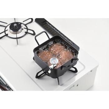 鉄製で熱伝導が良く、強火で一気に加熱できるため、食材をカラッと揚げられる。温度計付きで油の温度を正確に測れるため、天ぷらや唐揚げなどを失敗なく調理可能。コンパクトサイズで、少量の油でも効率よく揚げ物ができる。四角形なので収納しやすく、調理台でも安定して置ける。オール熱源対応