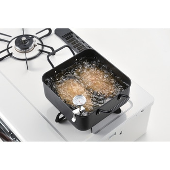 鉄製で熱伝導が良く、強火で一気に加熱できるため、食材をカラッと揚げられる。温度計付きで油の温度を正確に測れるため、天ぷらや唐揚げなどを失敗なく調理可能。四角形なので収納しやすく、調理台でも安定して置ける。オール熱源対応