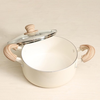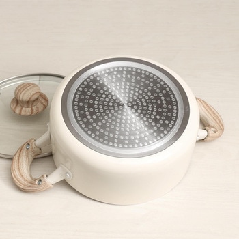 表面加工/内面:セラミック塗膜加工、外面:焼付け塗装、本体:アルミニウム合金、はり底:ステンレス鋼(クロム16%)、取っ手:フェノール樹脂(耐熱温度150℃)、蓋:強化ガラス製器具(全面物理強化)、縁リング:ステンレス鋼、つまみ・座板:フェノール樹脂(耐熱温度150℃)