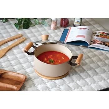 表面加工/内面:ふっ素樹脂塗膜加工 外面:焼付け塗装 材料の種類/本体:アルミニウム合金 はり底:ステンレス鋼(クロム16%) 取っ手:天然木 蓋 品名/強化ガラス製器具 強化の種類/全面物理強化 その他の材料/縁リング:ステンレス鋼 つまみ:天然木
