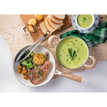 表面加工/内面:セラミック塗膜加工、外面:焼付け塗装、本体:アルミニウム合金、はり底:ステンレス鋼(クロム16%)、取っ手:フェノール樹脂(耐熱温度150℃)