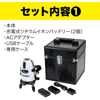 仕様三脚取付部:5/8 インチ、傾斜警告:有 補正範囲外時ブザー音、回転微動装置:有 エンドレス全周微動ネジ (左右両側配置)、本体回転機構:360°セット内容本体×1、充電式リチウムイオンバッテリー×2、ACアダプター×1、USBケーブル×1、専用ケース×1、レーザー受光器(LBP-PRG)×1、レーザー三脚(LBP-EL2)×1材質本体:ABS、台座:アルミ金具質量(kg)4.03(1.63)、970(電池含む)使用温度範囲(℃)-10~+40電源(V)充電式Li-ion電池パック(充電時間:約3.5時間)、AC100(付属のUSB-ACアダプター・USBケーブル使用)、本体寸法(mm)123×115×193精度水平,垂直 ±1mm/10m 鉛直 ±1mm/5m線幅(mm)2/5m対応受光器: 付属LBP-PRG使用周波数10kHz ±10% (通常モード)、30μs / 10kHz ±10% (省エネモード)連続使用時間全照射:約8時間(通常モード、使用環境により異なる)機能照射ラインメモリ:有、自動補正OFF:有光源515nm ±2% 緑色半導体レーザー (ラインレーザー)、650nm 赤色半導体レーザー (地墨レーザー)自動補正範囲±3°制動方式磁気制動方式到達距離(m)最大:屋外約30 (別売LBP-PRG使用時、使用環境により異なる)防塵防水性能有 IP54相当光出力7mW以下 クラス2 (JIS C6802:2018)警告有 電池残量表示LEDパルス幅(μs)50内容量1セット(2点)