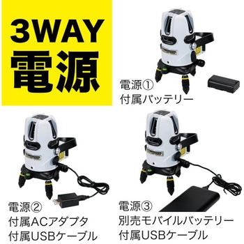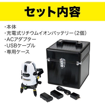仕様回転微動装置:有 エンドレス全周微動ネジ (左右両側配置)、本体回転機構:360°セット内容本体×1、充電式リチウムイオンバッテリー×2、ACアダプター×1、USBケーブル×1、専用ケース×1材質本体:ABS、台座:アルミ金具質量(kg)2.43、970(電池含む)サイズ三脚取付部:5/8 インチ質量(g)970(電池含む)使用温度範囲(℃)-10~+40電源(V)充電式Li-ion電池パック(充電時間:約3.5時間)、AC100(付属のUSB-ACアダプター・USBケーブル使用)、別売モバイルバッテリー(付属のUSBケーブル使用)本体寸法(mm)123×115×193精度水平・垂直 ±1mm/10m 鉛直 ±1mm/5m線幅(mm)2/5m対応受光器:別売LBP-PRG使用周波数10kHz ±10% (通常モード)、30μs / 10kHz ±10% (省エネモード)連続使用時間全照射:約8時間(通常モード、使用環境により異なる)機能照射ラインメモリ:有、自動補正OFF:有光源515nm ±2% 緑色半導体レーザー (ラインレーザー)、650nm 赤色半導体レーザー (地墨レーザー)自動補正範囲±3°制動方式磁気制動方式到達距離(m)最大:屋外約30 (別売LBP-PRG使用時、使用環境により異なる)防塵防水性能有:IP54相当光出力7mW以下 クラス2 (JIS C6802:2018)警告傾斜:有(補正範囲外時ブザー音)、有:電池残量表示LEDパルス幅(μs)50内容量1台