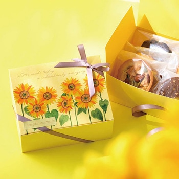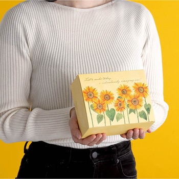 手描きのひまわりの花に金の箔押し文字を添えた黄色のギフトボックスです。