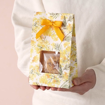 ミモザ柄に黄色のリボンが可愛い窓付ギフトペーパーバッグ(紙袋)です。