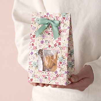 ピンクの花柄にグリーンのリボンが可愛い窓付ギフトペーパーバッグ(紙袋)です。