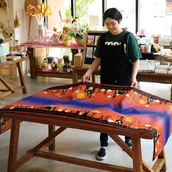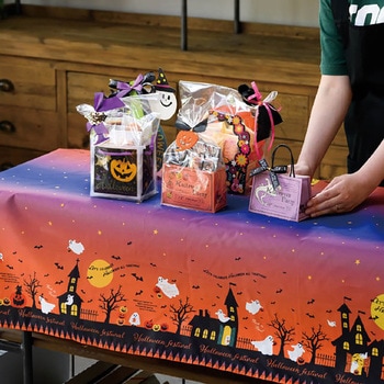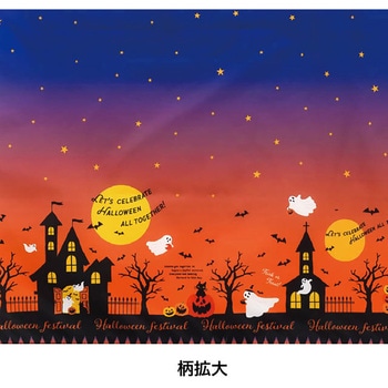 星空とオレンジ色のハロウィンの街並みがデザインされた、ハロウィンのディスプレイクロスです。