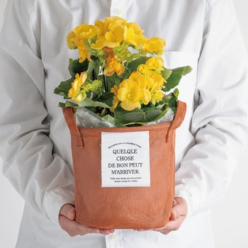 レンガ色のメッシュ生地に白タグがおしゃれなラウンドバスケット(5号苗サイズ)です。