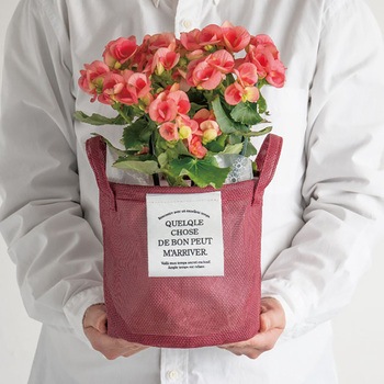 ワインレッドのメッシュ生地に白タグがおしゃれなラウンドバスケット(5号苗サイズ)です。