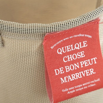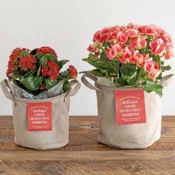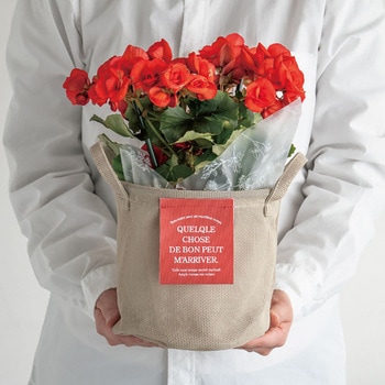 ベージュのメッシュ生地に赤タグがおしゃれなラウンドバスケット(5号苗サイズ)です。