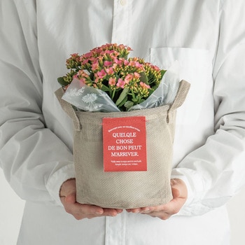 ベージュのメッシュ生地に赤タグがおしゃれなラウンドバスケット(4号苗サイズ)です。