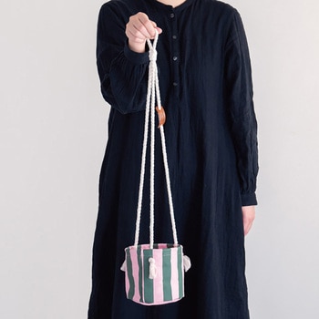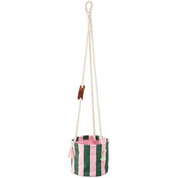 ピンクとグリーンのストライプ柄と白いロープが可愛い4号苗サイズの布製のハンギングポットカバーです。