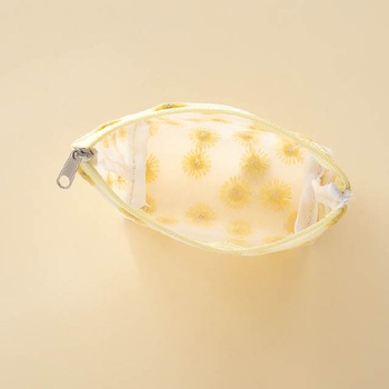 透け感のある生地に、イエローのかわいい花が散りばめられたおしゃれなハンドメイドのポーチです。